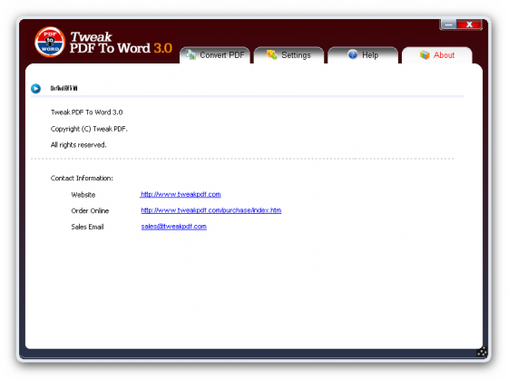 Tweak PDF Converter – самый аккуратный конвертор PDF-документов в формат Word в мире. Преобразовывает PDF Word со 100% точностью с полным сохранением форматирования. Переносит в редактор Word все таблицы, изображения, макет, текстовое содержание включая отдельные элементы PDF – логотипы, баннеры, схемы и т. д. В результате работы Tweak PDF Converter пользователь получает документ Word, полностью доступный для редактирования любого элемента. При сохранении обработанного документа, кроме основного формата Word, есть возможность сохранения в формате RTF (Rich-Text Format). Отдельно хочется отметить, что для работы программы пользователю нет необходимости иметь на компьютере ни пакет офисных приложений Microsoft Office, ни Adobe Acrobat и Acrobat Reader. - Вся работа производится автономно.