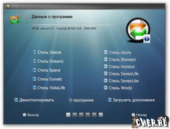 XPLife - программа предназначена для изменения интерфейса Windows XP x86 (32-bit), делая его похожим на Vista и Seven. Отличительной чертой XPLife является стабильная работа и поддержка двух собственных точек восстановления системы. При трансформации системы, изменяется огромное количество иконок, картинок, добавляются новые функции, звуки, курсоры, обновляются до 500 системных файлов, всего около 4000 ресурсов. Интерфейс Windows выдержан в нескольких тонах, одиннадцать стилей оформления и одиннадцать тем, выбор удовлетворит даже самых требовательных пользователей. Программа изменяет только визуальную часть файлов Windows не затрагивая программный код, поэтому безопасна в использовании и не потребляет дополнительные ресурсы, используются только системные.