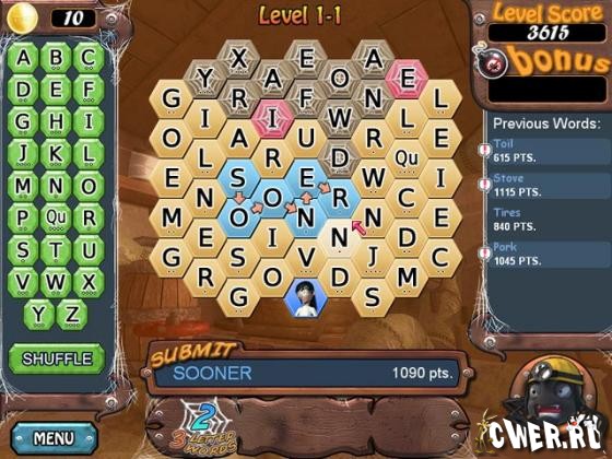 Неудачный научный эксперимент привел к ужасным последствиям: десять пауков стали супер разумными, захватили ваш дом и теперь там безобразничают. Соединяйте буквы в слова, сметая, таким образом, паутину! Если вы используете в словах бонусные фишки с буквами, такие как бриллианты, рубины и изумруды, вы получите дополнительные очки. Кроме того, в игре есть бонусное слово, составив которое вы сможете избавиться от противной паутины. Но будьте осторожны! Не спускайте глаз с пауков, ведь они хотят опутать вам своей паутиной!