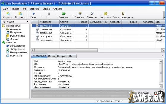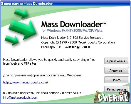 MetaProducts Mass Downloader - программа для удобного скачивания файлов из Интернета по протоколам HTTP и FTP, созданная на базе Offline Browser, разница только в том, что менеджер закачки загружает указанные пользователем файлы, а оффлайн-браузер - все файлы сайта. Программа разбивает закачиваемый файл на части и качает все части одного файла одновременно, тем самым увеличивая скорость. Может автоматически соединиться с провайдером, закачать файл и отключиться. Также позволяет докачивать файл после разрыва соединения (при условии, что сервер поддерживает докачку). Поддерживаемые протоколы HTTPS, FTP, RTSP, MMS, MMST и PNM. Имеется интеграция с веб браузерами Internet Explorer, Opera, Netscape Navigator, Mozilla, Firefox, Seamonkey и Flock. Программа имеет многоязычный интерфейс, включая русский язык и поддерживает работу с Windows Vista.