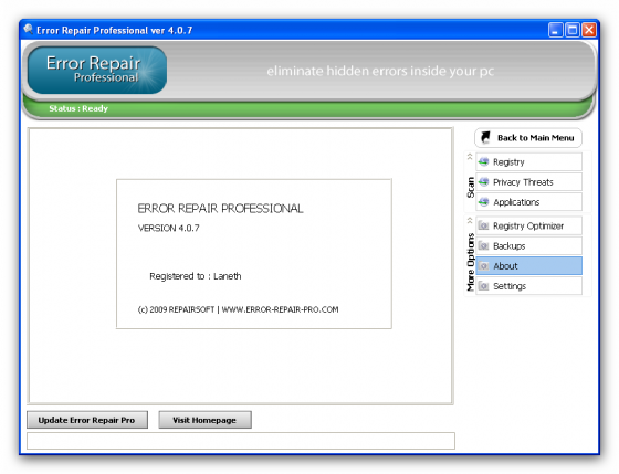 Error Repair Professional - cлужит для того, чтобы содержать Ваш PC в оптимально работающем состоянии. Error Repair Pro очистит и восстановит ошибки в Вашем PC единственным щелчком мыши. Всего несколько несколькими легких шагами, Вы сможете просмотреть весь реестр. Удалит, и исправит ошибки для любых неправильных записей и обеспечит вывод списка найденных ошибок. Так же Вы можете выборочно (вручную) исправлять любую ошибку или автоматически восстанавливать после сбоя в работе.