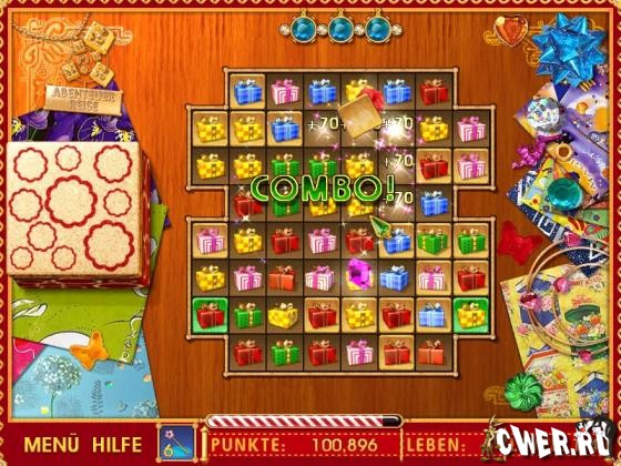 Эта игра кажется простой, но она вас не разочарует. Разноцветные подарки выглядят очень привлекательно, время летит неумолимо, и так хочется набрать побольше очков! Ваша задача состоит в том, чтобы очистить все цветные плашки на поле, соединяя поверх них по три и более одинаковых подарков. Игра порадует очень красивой графикой и приятной музыкой.