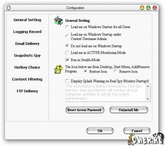 Real Spy Monitor - программа-шпион, записывает в лог-файл все действия пользователя за компьютером. Позволяет отслеживать: нажатые на клавиатуре клавиши, запускавшиеся программы и открывавшиеся документы, принятые и отправленные сообщения в Интернет-пейджерах AOL, ICQ, MSN, AIM, Yahoo Messenger, а также делает периодические снимки экрана.