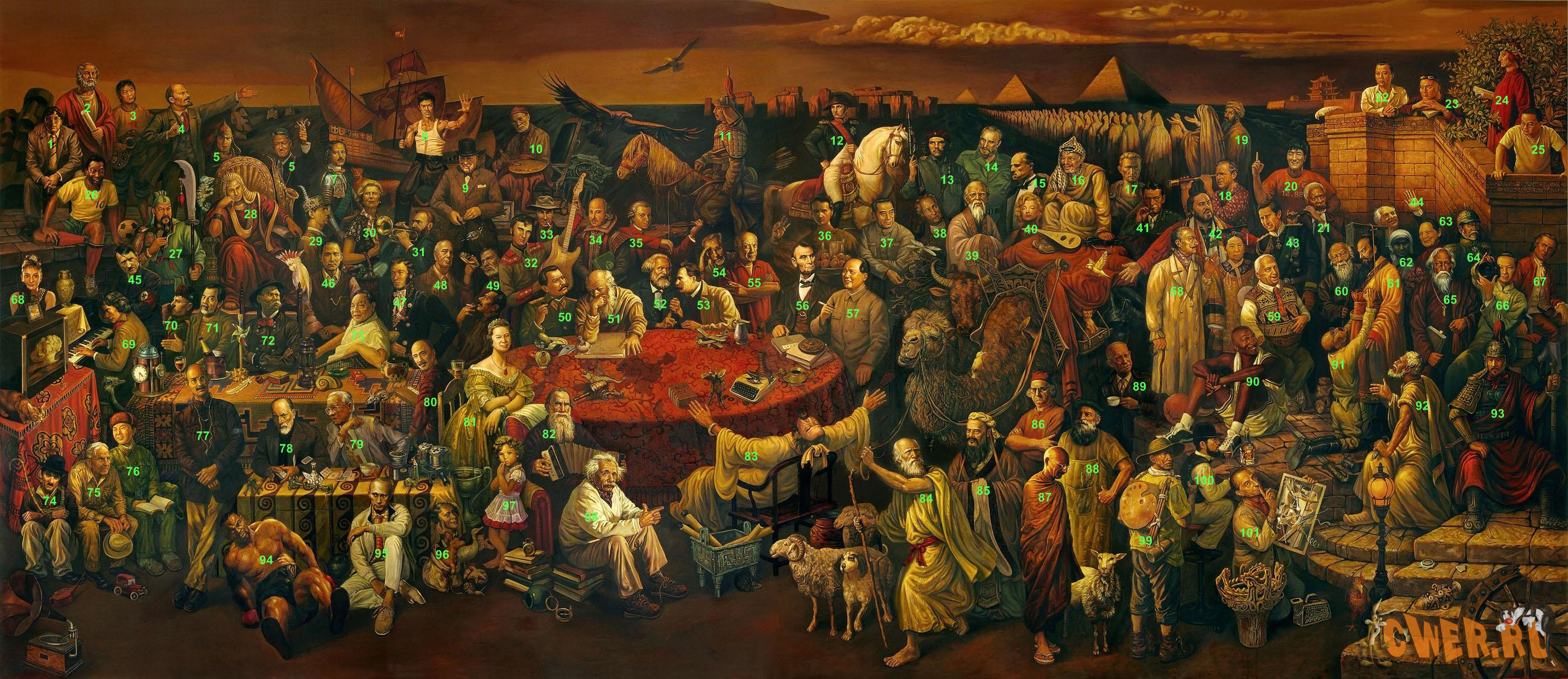 На картине сотня, вернее сто один великий человек. Тут и писатели и художники, артисты и диктаторы... Одних, мы продолжаем любить, других - ненавидеть. Но каждый из них оставил след в истории Человечества.