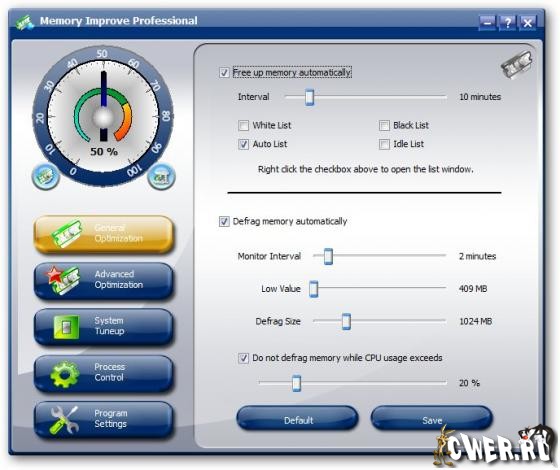 Memory Improve Professional – это один из полезных инструментов, который в информативной форме в виде прибора показывает текущее состояние потребления памяти и может автоматически или вручную производить дефрагментацию и освобождать для вас ресурсы в виде дополнительной памяти. Это в целом улучшит работу системы, уменьшит время её загрузки и повысит её производительность.