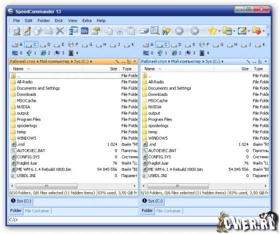 SpeedCommander - файловый менеджер с многочисленными, в том числе и уникальными, возможностями по работе с файлами. Из не совсем обычных функций имеет смысл обратить внимание на мощную систему шифрования файлов (файлы сжимаются - внутренняя поддержка ARJ, ZIP, LHA, RAR, CAB, ACE, GZIP, TAR и UUE, затем шифруются по стойкому алгоритму DES, а потом ещё и их названия можно защитить паролем). Кроме этой довольно редко встречаемой опции, в SpeedCommander имеется встроенная поддержка просмотра около восьми десятков графических и текстовых форматов; есть полнофункциональный текстовый редактор с подсветкой синтаксиса и не менее полнофункциональный FTP-клиент.