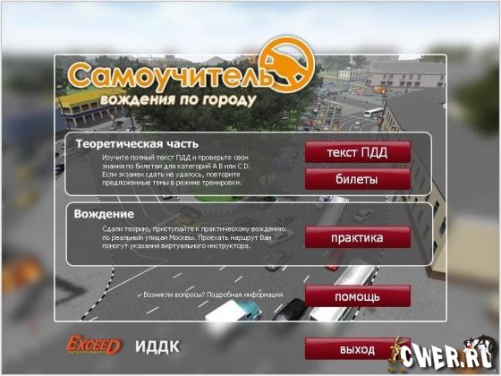 Самоучитель вождения по городу и Ппавила дорожного движения 2010 подготовят Вас к теоретическому и практическому экзаменам на получение водительского удостоверения категорий: А, B, С, D, а главное – поможет овладеть навыками управления автомобилем в условиях города, изучить реальные маршруты московских экзаменационных подразделений ГИБДД.