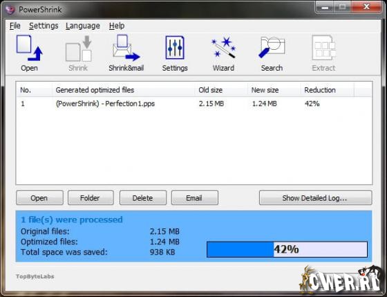 PowerShrink - Программа для сжатия и уменьшения размеров файлов Microsoft PowerPoint, Microsoft Word и Microsoft Excel, позволяя сжимать их без потери качества и содержания. Большинство протестированных файлов уменьшаются от 50% до 90% от начальной презентации. Программа содержит различные механизмы сжатия, основанные на внутренней структуре документа и позволяет настраивать качество, разрешение и многие другие параметры JPEG картинок, которые находятся в документе.