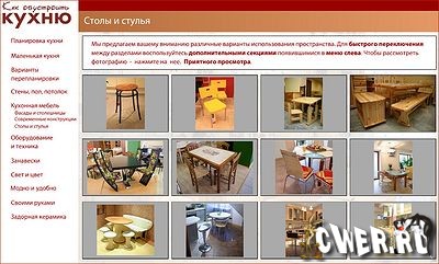 Диском удобно пользоваться, если вы одновременно листаете спецвыпуск издания "Магия Дома" - "Как обустроить кухню", поскольку фотоснимки иллюстрируют те идеи, советы и пожелания по оформлению кухни, которые можно найти в печатном издании, и сгруппированы по тому же тематическому принципу.