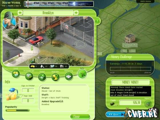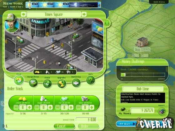 Игра просто набита потрясающей графикой, множеством типажей покупателей, различными улучшениями оборудования, и содержит 19 различных областей. Еще никогда продавать лимонад не было так интересно! Посмотрим, сможете ли вы стать лимонадным магнатом города Нью-Йорк.