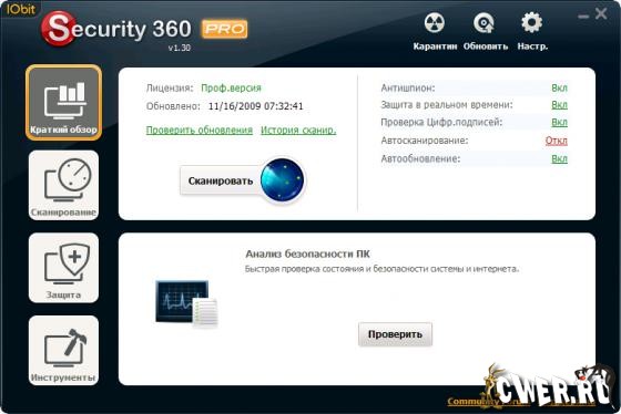 IObit Security 360 - утилита предназначена для удаления шпионских программ и вредоносного ПО, которая обнаруживает, удаляет и защищает ваш компьютер от различных потенциальных шпионов, рекламное ПО, троянов, клавиатурных шпионов, ботов, червей, и угонщиков.