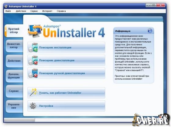 Ashampoo UnInstaller отслеживает и регистрирует изменения, которые вносят инсталляционные программы, что позволяет при необходимости корректно - то есть полностью - удалить ненужную программу. Положительным качеством является то, что UnInstaller удаляет не только те приложения, что были установленны с ее помощю, но и путем анализа деинсталлирует программы, мониторинг которых не производился. Кроме своей основной функции программа может: искать и удалять пустые папки; одинаковые и временные файлы; просматривать список всех установленных в системе шрифтов и удалять ненужные; удалять временные файлы Интернета, 'кэшированный' контент, файлы cookies, адреса сайтов введенные в ручную.