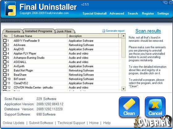 Final Uninstaller offers a new and better way to make your PC run more efficiently by cleaning up files and registry entries that were left after unsuccessful uninstallation. The program is based on a powerful leftovers database to support many functions of thoroughly scanning your computer, intelligently detecting leftover files of various programs, clearly listing applications that can be removed and completely uninstalling with only one click… This easy-to-use Final Uninstaller allows you to say goodbye to nerve-wracking leftovers and to speed up you PC performance.