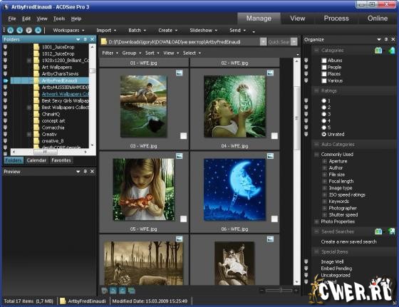 ACDSee Pro - профессиональная программа для работы с цифровыми фотографиями, которая обладает расширенным набором функций, рассчитанных на профессиональных фотографов. Поддерживает более 100 форматов графических файлов, позволяет работать с RAW-изображениями, автоматически сортировать фотографии по параметрам, полученным из цифровых фотокамер, содержит эффективный визуальный метод добавления к изображениям метатегов и быструю пакетную обработку большого количества картинок, в том числе и в RAW формате. Кроме того, здесь присутствуют инструменты для независимого регулирования цветовых каналов, исправления артефактов фотографий, появляющихся из-за погрешностей оптики, добавления "водяных знаков", работы с IPTC-метаданными, имеется возможность архивирования графических коллекций в ZIP-файлы, запись на CD или DVD и многое другое.