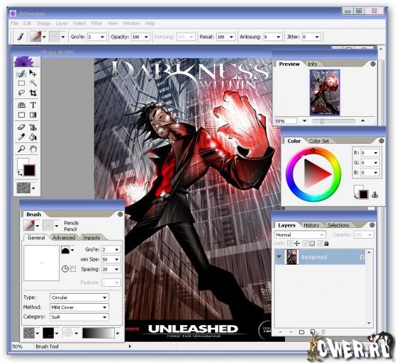 Artweaver по внешнему виду напоминает Photoshop - те же панели истории и слоев, палитра инструментов, область предварительного просмотра. Однако, в отличие от графического редактора от Adobe, эта программа содержит только инструменты для рисования. Используя их, можно раскрашивать изображения кистями, добавлять текст, заливку и градиент, рисовать линии, производить обрезку и т.д. Есть даже инструменты "штамп" и "волшебная палочка". Artweaver содержит очень удобные средства для выбора цвета: его можно выбирать как на цветовом круге, так и из набора наиболее часто используемых цветов. Одним словом, это отличная программа для детей и начинающих художников.