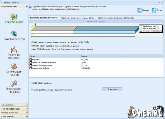 - Чистильщик диска, позволяющий устранить с диска лишнюю информацию, оставленную программами и системой