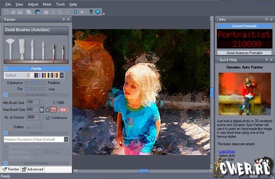 Dynamic Auto-Painter уникальная программа, которая позволяет превратить ваши фотографии в картины, используя имитацию техники рисования самых знаменитых художников планеты.В отличие от других подобных утилит, Dynamic Auto-Painter не изменяет саму фотографию, он просто использует изображение в качестве оригинала, с которого автоматически рисует новое изображение, используя соответствующие кисти и стили. При этом вы можете наблюдать за работой программы, как за работой настоящего художника.