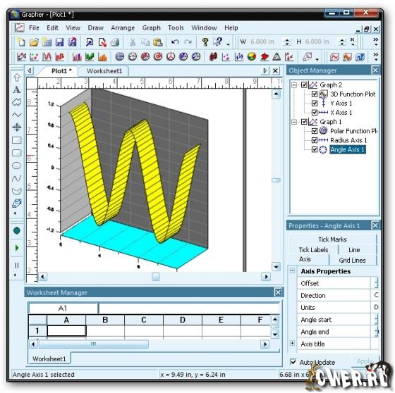 Простой в использовании графический пакет Grapher позволяет строить более 30 видов двухмерных и трёхмерных графиков. Кроме того, вы можете настраивать любую часть графика или создавать свои собственные графики, наилучшим образом описывающие ваши данные. Программа содержит 4 типа двухмерных графиков: линейные, столбчатые, полярные и специальные. Все эти типы графиков доступны и в трёхмерном исполнении. Если вам требуется отразить дополнительную переменную, вы можете воспользоваться графиками 3D XYZ, контурными картами или картами поверхности.