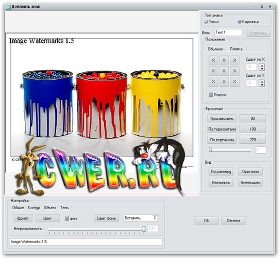 Программа Image Watermarks предназначена для создания водяных знаков на изображениях. Позволяет создавать знаки в виде текста, картинки с различными опциями (размер, цвет, позиция, прозрачность). Можно выбирать размер и тип сохраняемого файла. Есть возможность сохранять и загружать проекты знаков.