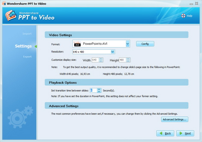 Wondershare PPT to Video - конвертер презентаций PowerPoint в популярные видео форматы, конвертирование готовых презентаций в MPEG, MPEG, AVI, MP4, WMV, MOV, FLV, 3GP форматы, поддержка PPT, PPS, PPTX, PPTM файлов презентаций, настройка и выбор качества, разрешения картинки из списка стандартных, запись и наложение звука с любого источника на компьютере, пакетный режим работы, нормализация аудио и видео качества, предварительный просмотр готового результата. Программа поддерживает iPod, iPhone, Apple TV, Zune, PSP, Pocket PC, Black Berry и др. видео форматы.