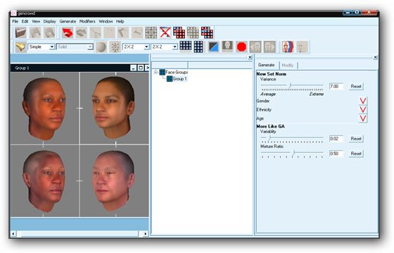 GenCrowd 3D позволяет создавать реалистичные 3D модели различных уровнях детализации, основанными такими факторами, как возраст, этническая принадлежность и пол. Программа позволяет создать любое количество уникальных 3D моделей. Как только вы создали желаемого человека или группу, можно сохранить и экспортировать сетку и текстуры во многие популярные пакеты 3D анимации (майя, VRML, FBX, XSI).