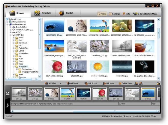 Wondershare Flash Gallery Factory - очень мощная и в тоже время простая в пользовании программа для создания Flash галереи. Wondershare Flash Gallery Factory включает в себя большой набор шаблонов, которые позволяют делать разнообразные презентации снимков, как для web дизайна, так и обычные flash слайд шоу. Цифровой фотоальбом, 3D flash галерея, web галерея, flash слайд шоу, а также flash баннеры, можно создать в Wondershare Flash Gallery Factory без навыков программирования.