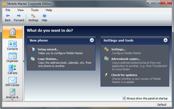 Mobile Master - менеджер работы с сотовым телефоном, а также iPod Video, iPod Nano через компьютер, мобильными телефонами Siemens, Sony Ericsson, Nokia, LG, Motorola, Samsung. Есть синхронизация данных с Outlook, Lotus Notes, The Bat, Eudora ,Outlook Express, Google calendar, Palm Desktop, Novell Groupwise, iTunes, и др., закачка музыки/картинок, работа с базами данных и телефонными книгами. Кроме синхронизации позволяет закачивать и скачивать файлы с iPod'ов и мобильных телефонов, отправлять и получать SMS, создавать резервные копии данных.
