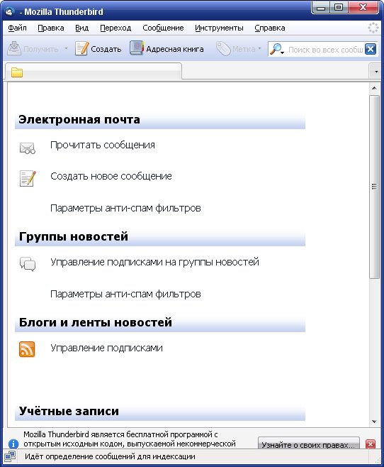Thunderbird - простая и удобная бесплатная программа для работы с электронной почтой от Mozilla. Программа поддерживает протоколы SMTP, POP3, IMAP и RSS. Имеет встроенный HTML редактор, который создает довольно компактный код, что в свою очередь уменьшает итоговый размер отправляемых писем в несколько раз. Поддерживает всевозможные кодировки, расширяется за счет дополнительных модулей и фильтрует рекламу, а так же нежелательную корреспонденцию. Интерфейс программы основан на технологии XUL, разработанной Mozilla Foundation, в результате чего интерфейс на всех платформах выглядит так же, как у приложений, разработанных для этой конкретной платформы. Интерфейс программы прост и удобен в использовании, поддерживает смену скинов. Во второй версии программы включено множество новых возможностей, помогающих вам лучше управляться с бурным потоком информации, устремляющимся в ваш почтовый ящик и быть в курсе последних событий.