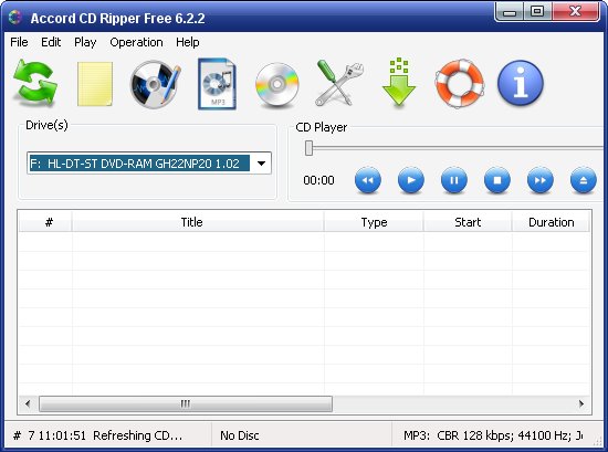 Accord CD Ripper - CD риппер, работающий с несколькими аудио форматами. Преобразовывает треки в wav и mp3 на довольно высокой скорости, которая еще увеличивается в многопроцессорных системах. Программа может искать информацию об альбомах как в локальных, так и в удаленных базах CDDB, эта информация затем может быть отредактирована. Запись мета-данных производится автоматически, есть встроенный CD плеер и многое, многое другое. Интерфейс программы предельно прост и дружественен.