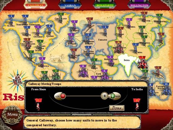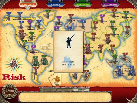Атакуйте. Защищайте. Отстаивайте свои территории, захватывайте новые – все это, бросив кости всего лишь раз! Выступите в роли генерала одной из армий в этой классической настольной игре с кинепластической музыкой и яркими визуальными эффектами! Сразитесь с компьютерными генералами, у каждого из которых свой стиль и характер, или вступите в сражение со своими друзьями. Даже если Вы не любитель военных стратегий, Вы не сможете остановиться, разрабатывая очередное наступление!