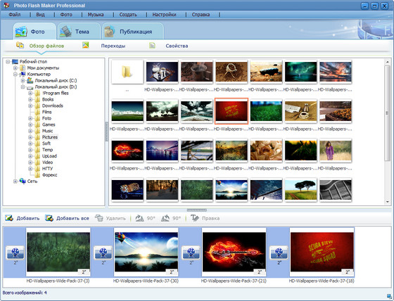 Photo Flash Maker Professional программа для создания анимированного FLASH-слайдшоу из обычных цифровых фотографий. Данная утилита предоставляет более 200 эффектов перехода одной фотографии в другую, имеет различные темы внешнего оформления и позволяет устанавливать музыкальное сопровождение. В настройках утилиты можно указать продолжительность показа отдельной фотографии и время ее перехода в другое изображение.