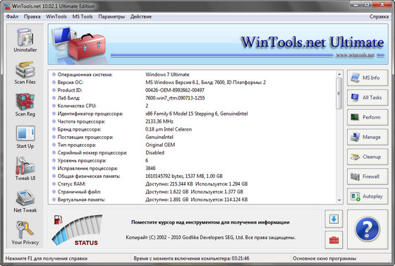 WinTools.net Ultimate – набор инструментов для оптимизации операционной системы Windows. В состав программы входят компоненты для полного удаления нежелательных программ и «мертвых» ссылок реестра, а также для контроля процессов, настройки системы, интернет-соединений и интерфейса. Кроме того, имеются утилиты для надежного хранения конфиденциальной информации.