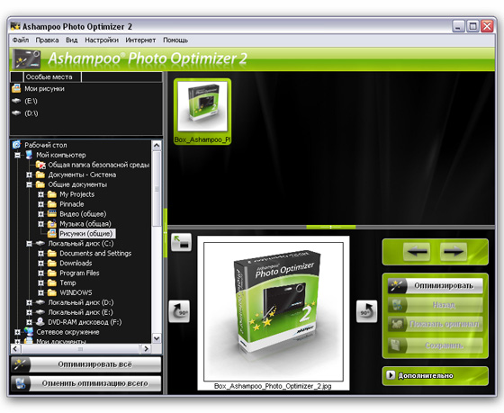 Цифровые камеры теперь есть почти у каждого. Проблема в том, что фотографии далеко не всегда получаются такими, какими их хотел бы видеть снимающий. Они слишком темные, с плохой контрастностью и неяркими цветами. Часто они получаются размытыми и блеклыми. Можно потом обрабатывать каждую фотографию с помощью профессионального редактора изображений и доводить ее до совершенства. Но все ли умеют это делать? У тех же, кто умеет, часто не хватает времени - для обработки фотографий его может потребоваться много. Именно поэтому Ashampoo Photo Optimizer необходим каждому, пользующемуся цифровой камерой. Программа открывает фотографии и показывает их в своем окне. Одного щелчка мышью достаточно для полной оптимизации снимка. И эффект от этой оптимизации вас впечатлит.