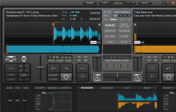 - 2 доступных деки для загрузки MP3, WAV или OGG файлов