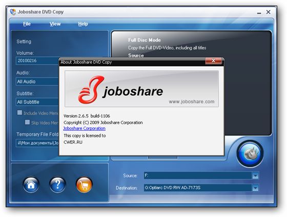 Joboshare DVD Copy - программа для быстрого клонирования и создания резервных копий ваших DVD. Поддерживает точное копирование DVD 1:1, а также копирование DVD с любым региональным кодом. Может копировать DVD в ISO-файл или папку DVD на жестком диске и наоборот, записывать их на DVD. Способна сжимать DVD-9 (двухслойный DVD) до размеров обычного DVD-5 диска. Позволяет удалить ненужные DVD меню, любые субтитры, звуковые дорожки и копировать только фильм.