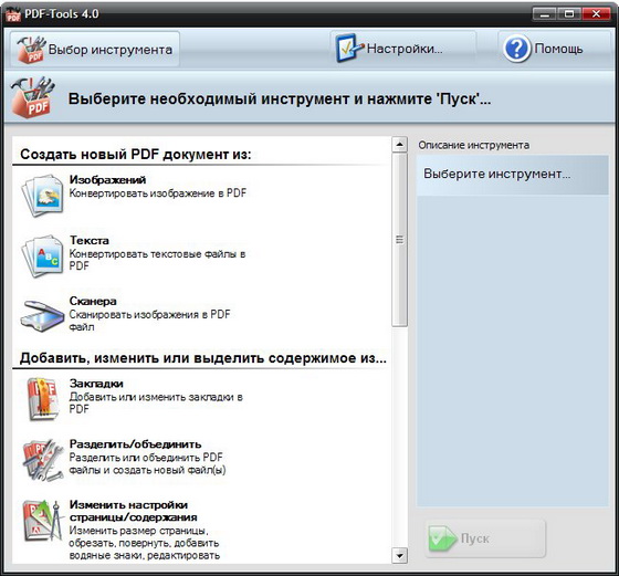 PDF-Tools — набор полезных инструментов для манипуляции с PDF файлами. С помощью данного набора вы сможете с легкостью создавать новые PDF документы из изображений, сканера и текстовых документов, изменять содержимое существующих PDF документов (добавление закладок, объединение и разъединение PDF файлов, извлечение страниц и изображений, оптимизация PDF документов, изменение настроек PDF документа, включая размер и разрешение страницы, конвертация PDF в оффисные документы и т.д.), а также отправлять и загружать файлы по почте или через FTP-соединения. Стоит упомянуть, что данная программа входит в состав PDF-XChange Pro. Все операции в программе осуществляются с помощью пошаговых мастеров. Интерфейс программы многоязычный и обладает поддержкой русского языка.