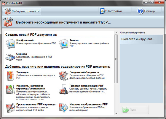 В комплекте с профессиональной версией PDF-XChange поставляется также PDF-Tools - инструмент для создания новых PDF-файлов из изображений и манипулирования имеющимися файлами. С помощью этого инструмента можно с легкостью объединять PDF-файлы, удалять из них страницы, извлекать отдельные фрагменты, изображения и текст, создавать и редактировать закладки, а также отправлять файлы по электронной почте и размещать их на серверах по протоколам HTTP и FTP.