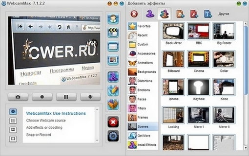 WebCamMax - продвинутая утилита для работы с веб-камерой. Программа, добавляющая изумительные видеоэффекты на все вебкамеры, даже без реальной камеры. Программу можно использовать по умолчанию в таких приложениях, как ICQ, AIM, MSN, Camfrog, Skype, Paltalk, Yahoo, ANYwebcam, Stickam. Можно настроить WebcamMax Full так, чтобы она начинала функционировать и вести трансляцию с камеры только в том случае, когда объектив зафиксирует движение.