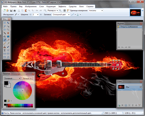 Paint.NET - простой, но мощный и удобный редактор графики. Позиционируется как отличная замена стандартному MS Paint из поставки Windows. Поддерживаемые форматы: BMP, IPEG, PNG, TIF, GIF, TGA и собственный формат PDN. Основные возможности: работы со слоями, применение эффектов, работа со сканером и камерой, коррекция красных глаз, масштабирование от 1% до 3200%.