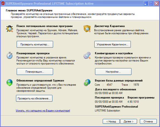 SUPERAntiSpyware сканирует память, реестр и файлы на предмет заражения шпионскими модулями. Средствами программы найденных паразитов можно удалить или поместить в карантин. Предусмотрена возможность сканирования тремя способами: при быстром сканировании проверяются только самые распространенные места заражения, при полном - все файлы, а в третьем режиме можно самостоятельно выбрать область проверки. Встроенный планировщик поможет организовать проверку компьютера в заданное время. Кроме этого программа умеет защитить от изменений стартовую страницу браузера, восстановить настройки Интернет-соединений, Рабочего стола, уровня безопасности Internet Explorer и многих других параметров. Чтобы эффективно бороться со шпионскими модулями и вредоносными программами, утилита автоматически обновляет свою базу данных через Интернет.