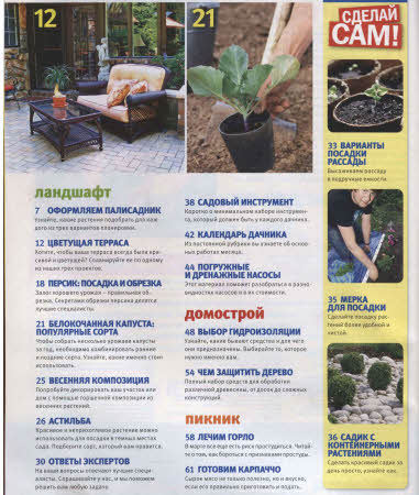 Популярный иллюстрированный журнал о загородной жизни круглый год. Информация на любой вкус: советы и рекомендации о том, как обустроить дачный участок, как построить дом; инструкции для тех, кто стремится сделать дачный ландшафт красивым и уютным; полезные советы о нахождении на садовом участке и за его пределами; информация о том, как выращивать овощи и фрукты на дачном участке и что делать с урожаем.