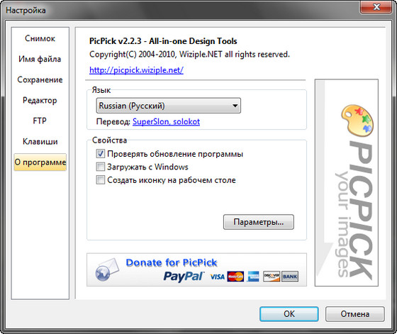 PicPick - бесплатное приложение, объединяющее в себе возможности простого графического редактора и утилиты для захвата изображений с экрана компьютера. PicPick обладает простым и удобным интерфейсом, не требует установки. Среди особых возможностей стоит выделить возможность захвата целого рабочего экрана (в том числе, и на мультимониторных системах), захват только активного окна, отдельной области, целых веб-страниц (с автоматической прокруткой) или же областей с произвольными границами. Графический редактор похож на Microsoft Paint, но обладает встроенными фильтрами и эффектами.