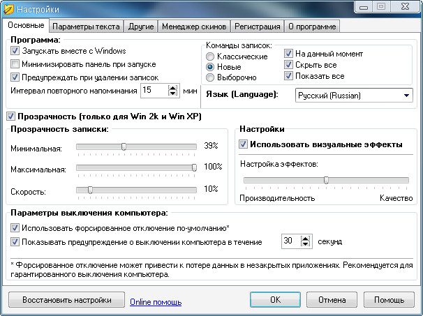 Отдельно хочется рассказать о настройке утилиты Power Notes. Дело в том, что при использовании рассматриваемой утилиты пользователь может самостоятельно задать шрифты записок и параметры печати, включить запуск программы вместе с Windows и установить степень прозрачности стикеров. Кроме того, в окне настроек можно выбрать проигрываемые для основных событий звуки, включить случайный выбор цветовой схемы и местоположения на экране "наклейки" при ее создании, настроить "горячие" клавиши, с помощью которых пользователь сможет быстро создавать новые стикеры, вызывать редактор, а также окно настроек рассматриваемой утилиты. Кроме того, среди параметров программы есть пункты, отвечающие за ее внешний вид. Так, например, пользователь может выбрать скин главной панели, а также язык интерфейса.