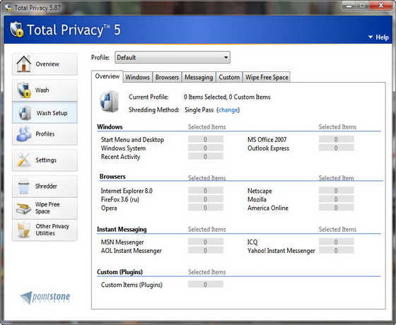 Total Privacy - специалист по уничтожению следов деятельности пользователя на компьютере. Приложение справляется с кэшем всех популярных браузеров и может подчищать историю интернет-пейджеров MSN Messenger, AOL, ICQ и Yahoo. Вдобавок программе по силам изменить историю посещенных страниц и недавно открывавшихся документов, а также многие менее существенные и не связанные с интернет-активностью "следы". Отметим еще возможность запуска программы по расписанию или по "условному сигналу" - к примеру, по закрытию браузера.