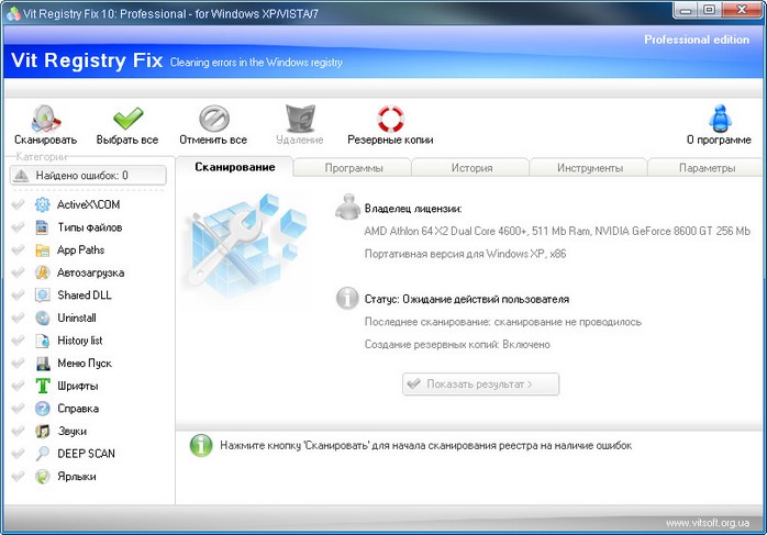 Vit Registry Fix - программа для очистки реестра от ненужных записей (ошибок). Так как после удаления програм в реестре оставляются различные ненужные записи, то со временем этих записей становится все больше и больше и это является причиной долгих задержек перед загрузкой програм, снижение общей производительности системы и других ошибок. Vit Registry Fix находит эти ошибки и разделяет их на категории (ActiveX\COM,Типы файлов, AppPath, автозагрузка, Shared DLL, Uninstall, History list, меню ПУСК, Шрифты, Справка, Звуки, Ключи Software (Deep scan) и дополнительно ищет битые ярлыки на дисках. Также есть возможность ручного удаления ключей из разделов Software (как для HKCU так и для HKLM), создания резервных копий перед удалением ошибок а также можно создать список исключения.