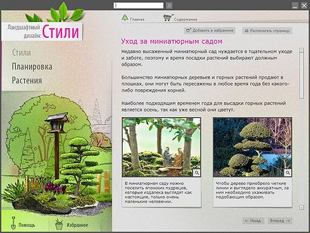 Обустройство сада – это увлекательное занятие, но возникает вопрос, с чего начать? Предлагаемый вашему вниманию мультимедийный диск поможет разобраться в современных тенденциях и приступить к работе. В разделе «Стили» можно узнать об основных типах садов. В «Планировках» вы почерпнете множество интересных идей и оригинальных решений. В разделе «Растения» представлены описания более 500 видов. Всего в программе - 125 схем устройства приусадебного участка.