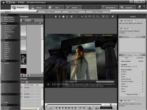 iClone - программа для легкого создания трехмерной анимации. В программе уже имеются готовые 3D-персонажи и все необходимое для создания их виртуального мира — одежда, реквизит, ландшафты. Присутствует и большая библиотека движений, которые можно присваивать персонажам. Интересной особенностью программы является возможность использования для лиц ваших трехмерных персонажей фотографии реальных людей. Для этого используется технология FaceTrix, превращающая фотографию в 3D-объект. Программа хорошо взаимодействует с редакторами 2D-графики, благодаря чему можно легко и просто редактировать текстуры. iClone также поддерживает программы 3ds Max или Maya, с помощью которых можно создавать элементы библиотеки для персонажей. Все сцены программа позволяет визуализировать в реальном времени с учетом рельефа, отражений и прозрачности.