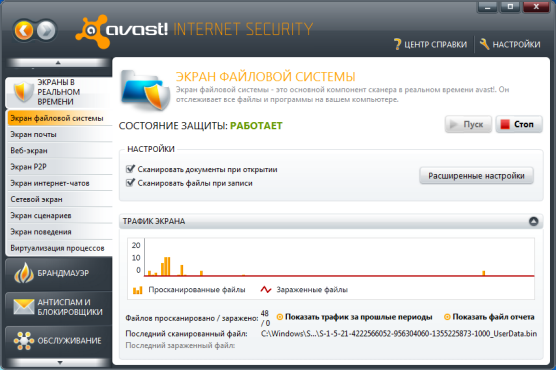 • Экран файловой системы - основной компонент сканера в реальном времени avast!. Он отслеживает все файлы и программы на вашем компьютере