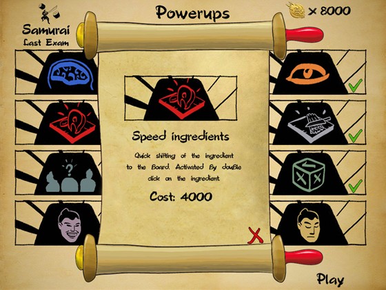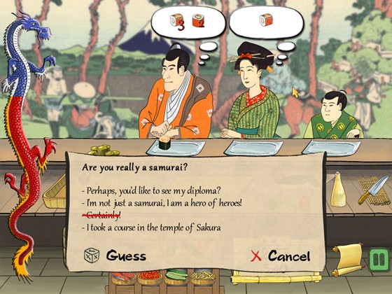 Вам предлагается пять уровней сложности, названных в честь воинских чинов средневековой армии. Начинающему суши-шефу очень трудно запомнить экзотические ингредиенты, а особенно рецепты, состоящие из пяти и более продуктов. Тут и пригодятся подсказки из кулинарной книги, которые можно приобрести за монеты с дракончиками.