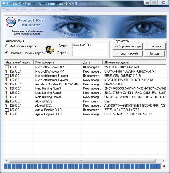После запуска программы достаточно будет нажать Find Keys и она сама просканирует реестр, и выдаст список программ, установленных на компьютере и регистрационные данные к нем. В программе есть окно для авторизации Администратора, если установлены ограничения на уровне пользователей. Может работать по сети с другими компьютерами и по заданному диапазону IP адресов или по списку IP в текстовом документе.